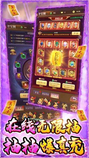1、上线赠送VIP20、勾玉88888、铜钱2000万,寻宝券100张、千元现金卡大礼包、称号:次日赠送周卡