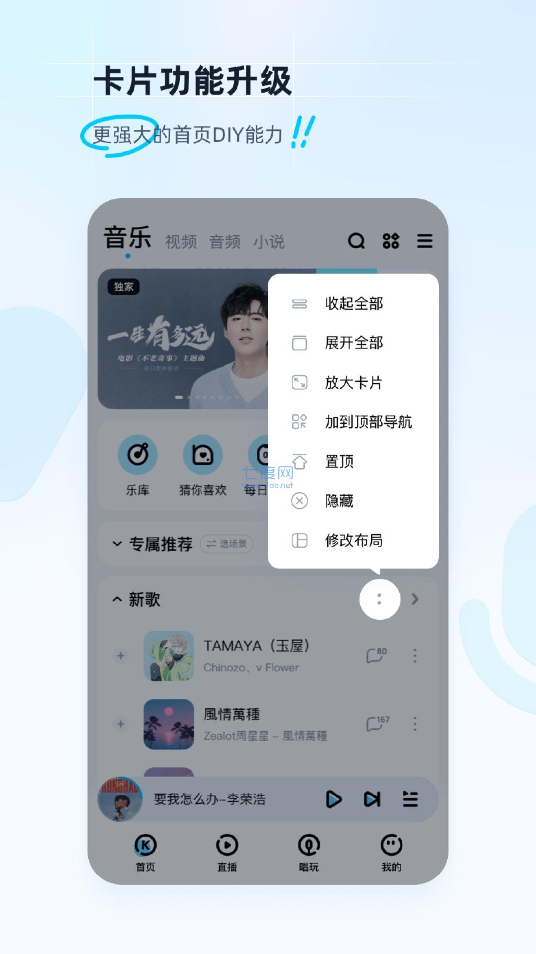 酷狗2022新版免费下载是酷狗音乐2022最新更新的版本,全球各大潮流音乐在这里的都能免费畅听,每天最新的热门音乐榜单分类,还会根据你的收听习惯整理专门的榜单推荐给你哦,一键设置我喜欢,还能自动添加筛选和视图哦,全新的智能吉他谱上线,是最懂你的音乐神器!