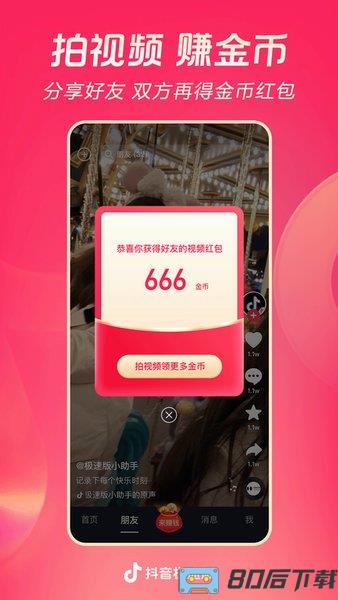 抖音极速版app是一款非常火的热门短视频app,这款极速版相比正版体积要小了很多,但是功能却保存良好,可以说是麻雀虽小,五脏俱全。用户第一次使用抖音极速版观看短视还能获得金币奖励,多多益善,还能赚取佣金哦!喜欢玩抖音的朋友们,快来80后下载站下载极速版试试吧!