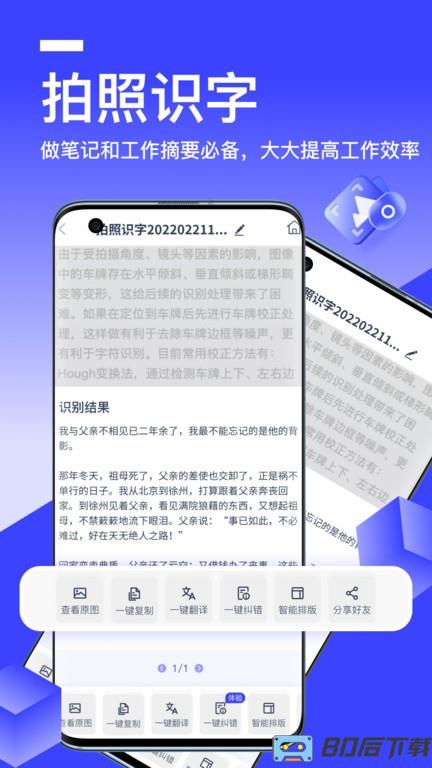 可连续拍照拼图识别图文或即时拍照识别各种文件、图片、书籍等,即识即译,准确迅速!