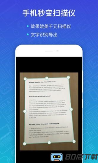 扫描全能王app是超多人都在使用的手机扫描工具,此工具安全方便,可以扫描文档,图片,还可以自动生成高清pdf图片,或者其他格式图片,此软件可以让用户直接连接打印机或者传真机,都可以在线高速传输打印,效果非常好,还可以吧经常用户文件存储到云盘,是商务办公的首选,如果你需要的话那就来80后下载站下载吧~