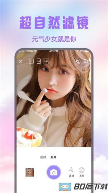 自带相机,用户通过该软件拍出美美的照片,在拍摄照片的时候去增添不同的美颜功能或者是滤镜功能。
