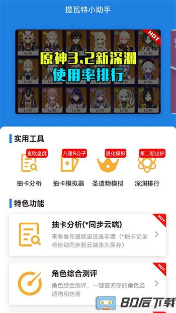 提瓦特小助手是专门为原神手游打造的游戏辅助类软件,可以通过软件获取原神抽卡的记录分析,而且平台上就可以查询各种圣遗物的分数,包括每一个圣遗物的信息都能够直截了当的获取,用户能在线获得良好的互动交流模式,而且还具备一些活动资源可以提,打造的最新的优质服务内容,不仅涵盖了抽卡分析还具备圣遗物评分效果。