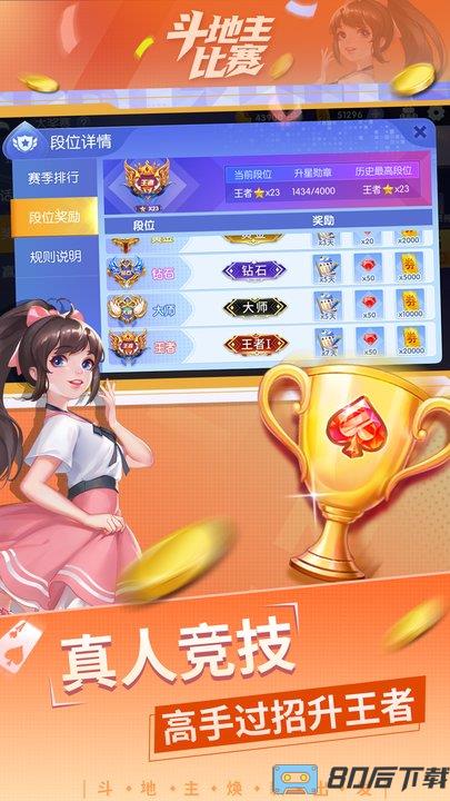 斗地主比赛手机版是一款经典的扑克游戏斗地主,游戏画面精美,游戏赛事种类丰富,玩法好玩有趣,多种斗地主玩法,支持真人匹配玩法,每天都有丰富的活动,实力比拼赢好礼,喜欢的朋友快来80后下载下载吧!