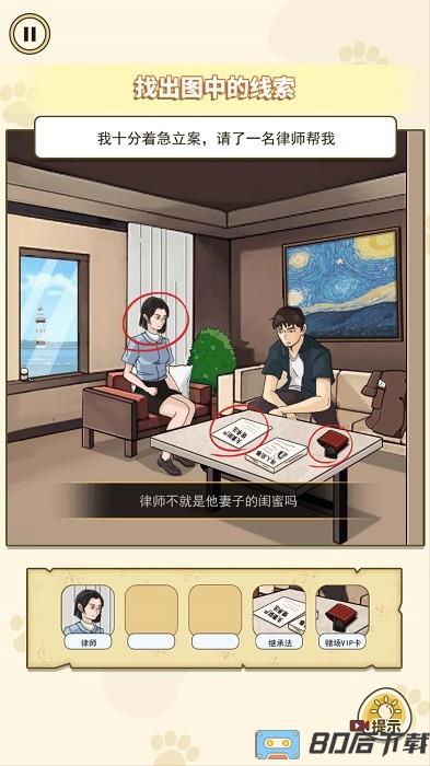 隐藏的真相,感受最趣味益智的休闲游戏玩法,在这里玩家需要灵活的打造发挥自己的洞察力发现所有的事件真相,游戏十分考验玩家的判断能力,玩家需要灵活的结合具体情况完成推理,感兴趣的玩家可以下载体验!