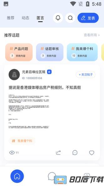2,匿言发表,等推荐多种话题,产品问题,话题审核,大家来爆料,采用不记名的模式,安全放心,表达出自己的观点,采用服务器级的保密措施,不用担心隐私泄露。