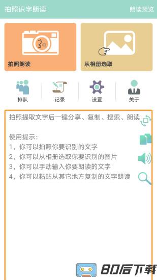 1,本软件可以将图片上的文字识别并朗读出来,支持中文、英文识别和朗读。