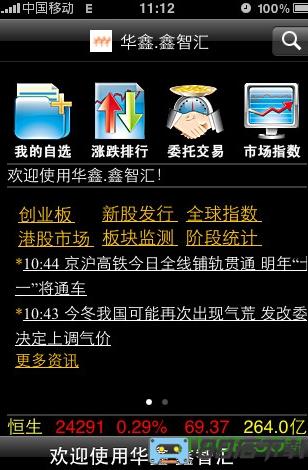 选中并点击华鑫证券大智慧手机炒股软件图标进入,首次登录用户需进行注册,注册方法为在登录时弹出的注册页面输入手机号,点击注册,系统将会下发短信注册码,用户在点击委托交易功能后弹出验证码输入框,输入验证码,等待系统验证后弹出注册成功字样;