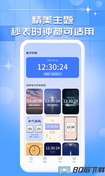 悬浮时钟秒表可以在任意APP上悬浮!可在手机桌面悬浮!悬浮时钟:多种时钟主题任您选择,秒表时钟都可以适用。
