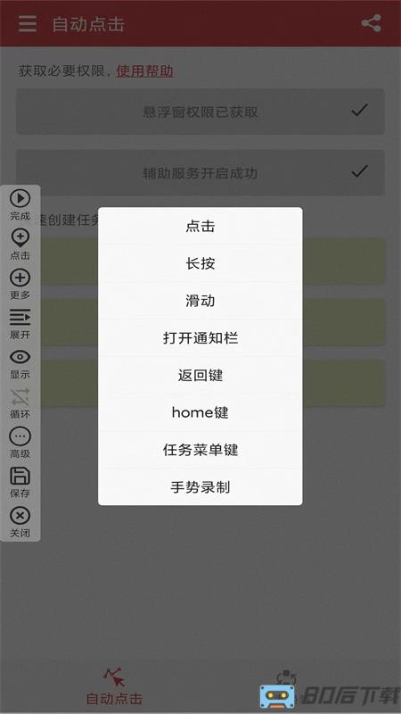 1. 创建点击任务的时候,可以开启不同的辅助权限,比如说悬浮窗权限以及辅助权限等等。2. 自由设置点击的频率比如说一秒点击10次,或者是两秒30次等等。3. 所有的操作非常简单,可以根据自己的需求输入,不同的点击任务。4. 创建好的点击任务全部输入完毕之后直接保存就能够快速操作。