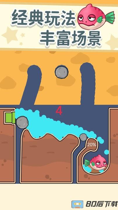 一条小鱼掉到坑里了,滑动屏幕将沙子划开让石头滚动堵住缺口。只有这样水才能流动到小鱼那拯救他。这是一款趣味益智的休闲冒险闯关游戏。在游戏中玩家将在沙子中滑动创造道路,根据出水口的位置来规划正确的移动路线,让石头滚动到缺口处但是别堵住水流动哦!否则无法到达小鱼的坑里。