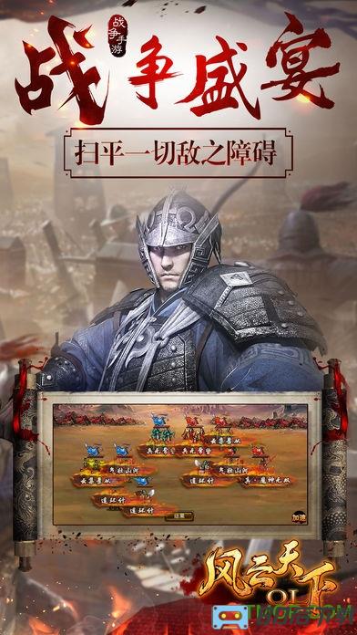 《风云天下OL》是一款以中国名著《三国演义》为题材的战争策略手机网游,游戏中设有战法,机械,策士等各类武将,身在乱世,选择哪些武将,完全掌握在友友手中!游戏中不仅提供了副本,对战,委派,作坊,军团建设等各色玩法,还可以在战斗中感受酷炫技能,让游戏体验倍感畅爽!游戏舍弃复杂的兵种搭配,为武将搭配唯一兵种。武将和兵种拥有特殊战法技能,使用丰富多变的阵法进行战斗,为游戏提供了无限的可能性,具有极高可玩性。