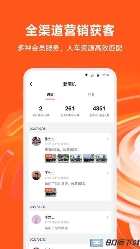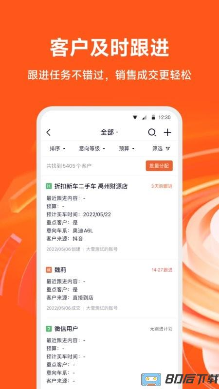 2、销售管理将客户的信息落到公司系统中,经理可以随时查看销售人员工作情况;系统会自动记录销售回访数据,并将客户需求车型与库存做匹配;