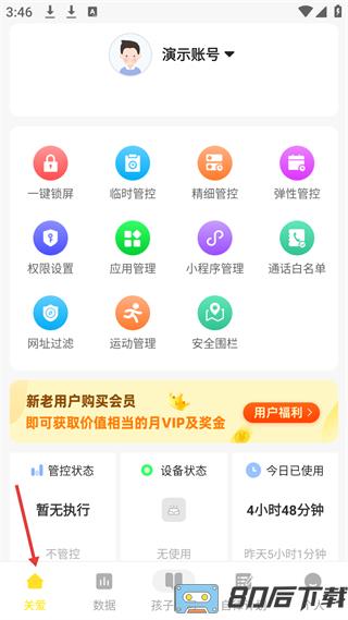 1、关爱页面提供一键锁屏与临时管控功能,实时显示设备状态与会员优惠活动。