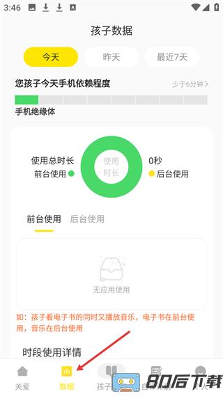 2、数据页面详细统计子女手机使用时长与依赖程度,支持分时段查看应用记录。