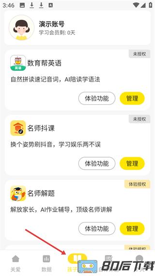 3、学习管理页面汇集数育帮英语等教育应用,支持功能体验与使用权限设置。