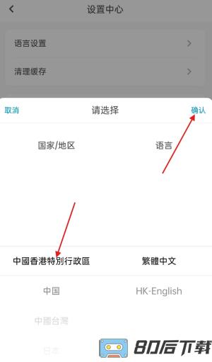 3、点击语言设置按钮进入多语言列表,从地区选项中选择中国香港特别行政区。