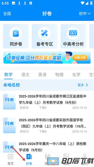 2、好卷专区包含同步练习与备考资源,收录各地名校月考试卷供对比学习。