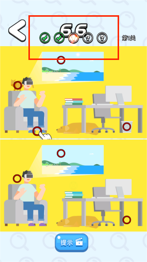 1、通过指尖触控精准标记两幅图片的相异之处,系统会实时反馈正误判断,错误标记将扣除相应时间作为惩罚。