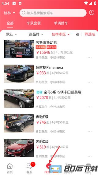 3、找婚车页面提供套餐与单车分类选项,支持多条件筛选并展示价格详情。