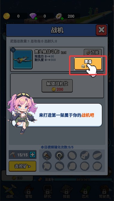1、在军械库界面点击需要装配的战机型号,系统会显示该战机的详细参数与解锁条件,确认资源充足后准备建造。