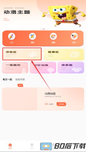 2、在首页找到并点击“涂色区”入口,即可进入绘画创作模块。