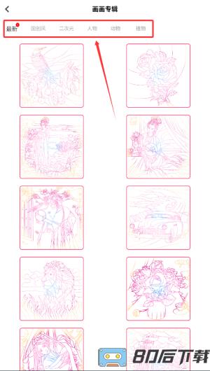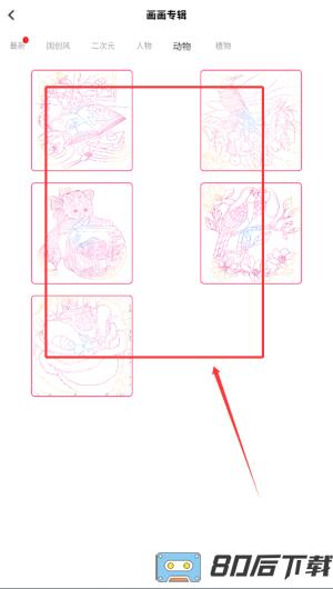 4、在所选类别中,挑选一张心仪的线稿图画,点击即可开始上色创作。