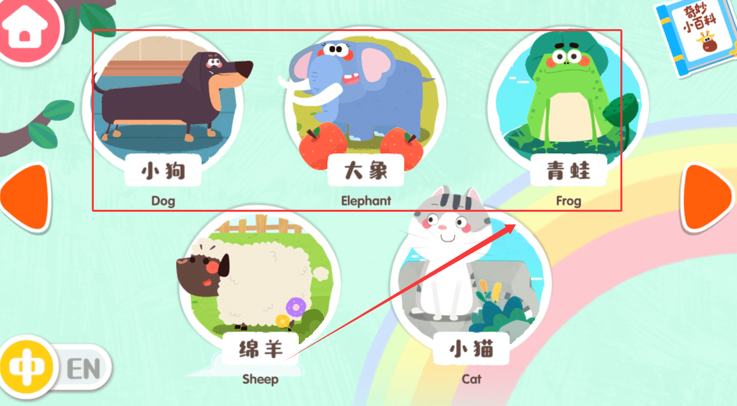 3、接着,探索动物家园与食性章节,将绵羊拖入草原,把青蛙放入池塘,理解不同动物的栖息环境。在用餐环节。