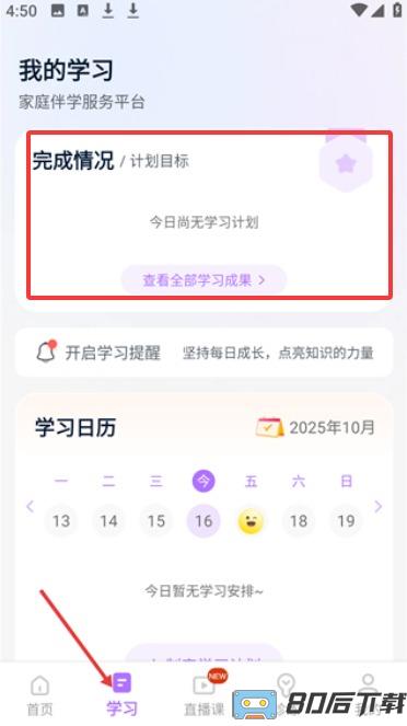 2、学习页面提供家庭伴学计划管理,支持学习提醒与日历视图等进度跟踪功能。