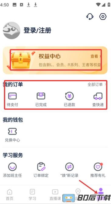 4、个人中心集成账户管理与权益服务,支持订单绑定等学习辅助功能配置。
