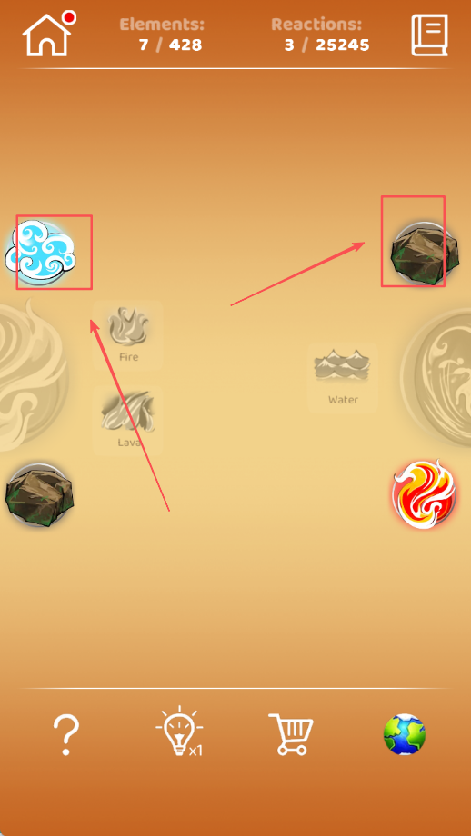 1、点击火元素图标开始组合实验,这是游戏的基础操作,需要熟悉元素拖拽和放置的基本技巧,为后续复杂合成打下基础。