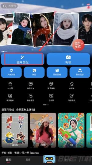 1、在“首页”中可快速进入图片美化、拍照、美颜和拼图等常用编辑功能,适合新手一键快速操作。