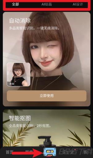 3、进入“AI修图”页面可使用自动消除、智能抠图等AI功能,提升修图效率并获得更自然的效果。