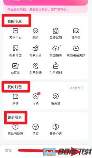 5、在“我”页面中可管理素材、证件照与试用服务,还能查看钱包余额与更多个性化会员服务。