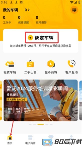 1、首页提供车辆绑定与设备租赁的核心功能入口,同步展示专业培训与设备管理资讯。