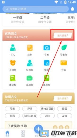 1、选择对应年级同步作文后点击进入频道,根据写人叙事等分类获取参考范文。