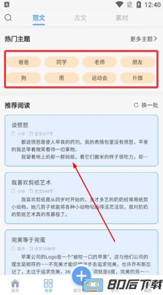 2、在范文页面浏览热门主题推荐内容,点击具体作文条目查看完整文章详情。