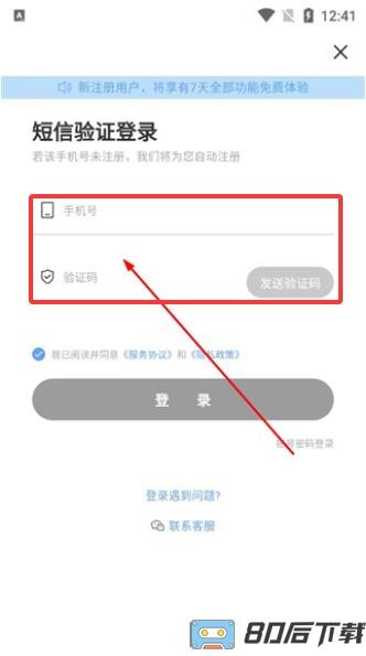 4、通过短信验证登录页面输入手机号获取验证码,同意协议后完成账户验证。