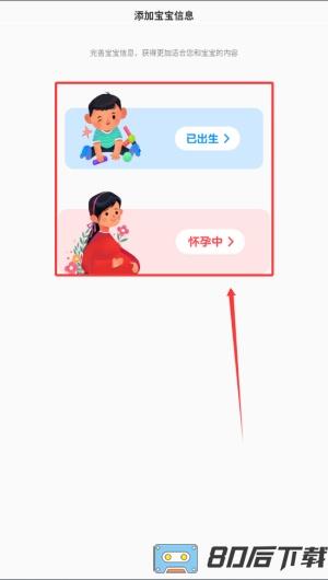 2、根据宝宝实际情况,在引导页选择“已出生”或“孕期”等对应状态。