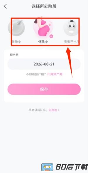 2、根据您的角色,在界面中选择对应的身份标签,如备孕者或准妈妈等。