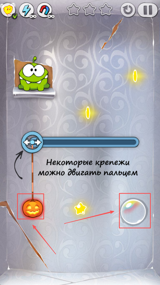 1、切割绳子控制移动,通过滑动屏幕切断不同绳子,利用重力让糖果或南瓜沿着预定路径移动,避开障碍收集星星。