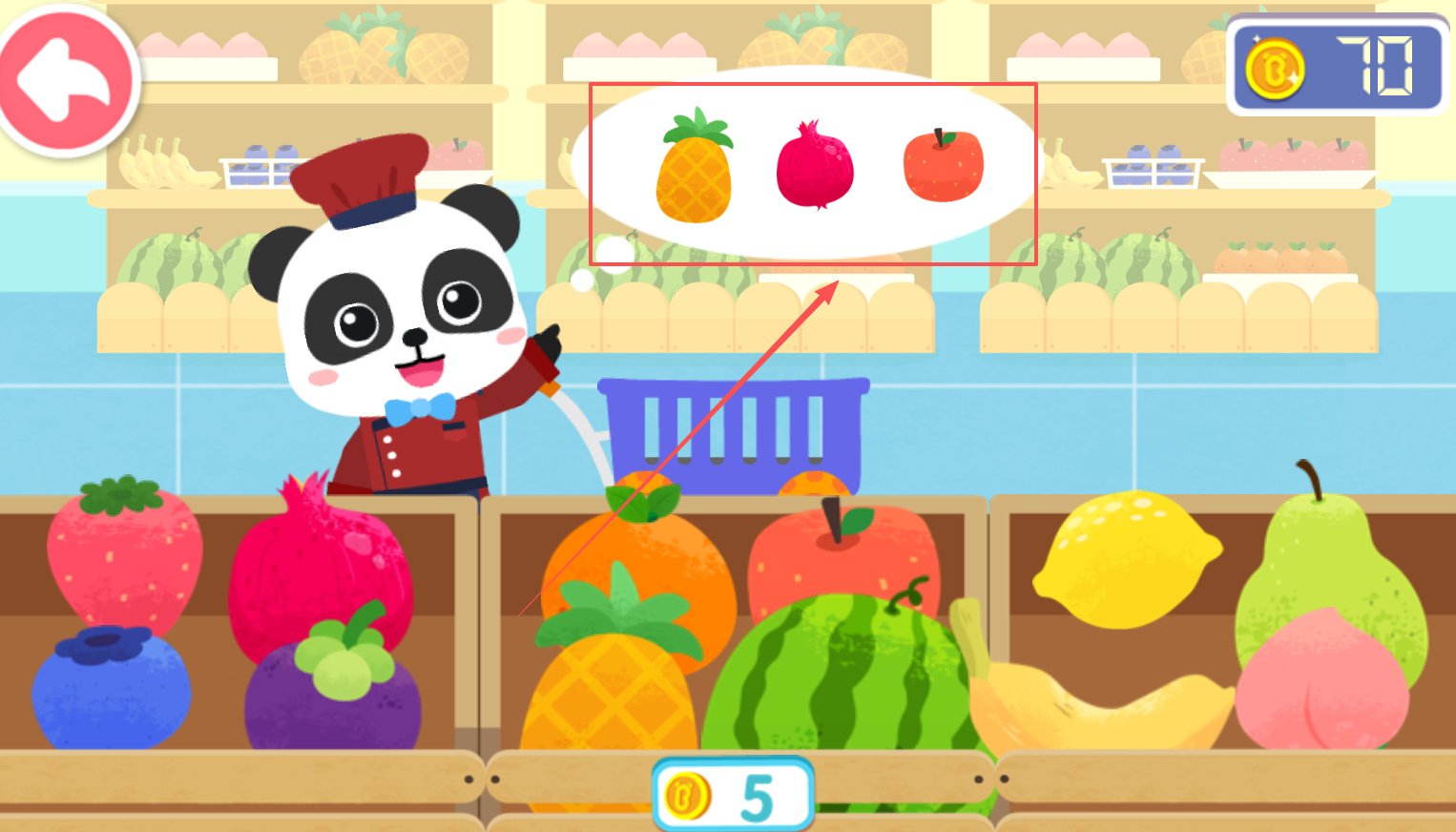 2、根据画面提示从琳琅满目的水果中挑选出指定的种类,这一步骤能够帮助孩子熟悉各种水果的外形与名称。