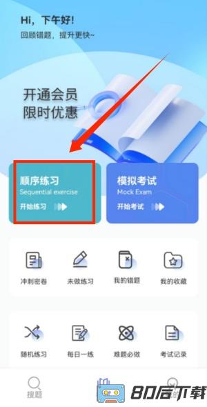 1、打开应用进入首页,在功能模块中点击“顺序练习”进入练习模式。