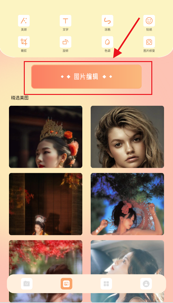 2、进入图片编辑界面,使用美颜工具优化肤质或添加文字涂鸦,结合贴纸与裁剪旋转功能调整画面细节,打造独特风格。