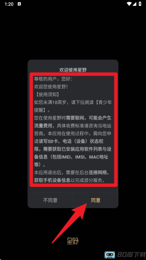 1、首次打开【星野】时,会弹出【欢迎提示】,提醒用户阅读《用户协议》与《隐私政策》,点击【同意】后可继续使用。