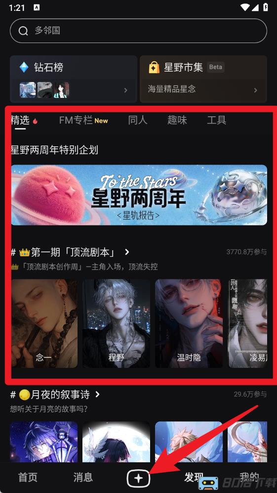 5、点击下方中间栏目,可浏览精选内容、FM 专栏、同人、兴趣和工具模块,参与话题讨论与活动。