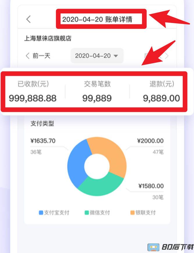 3、在账单详情页面可以查看每日收款金额、交易笔数及退款金额,并通过图表清晰分析支付宝、微信等支付占比。