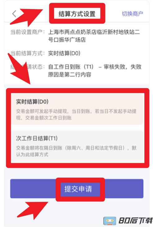 4、在结算方式设置界面可选择实时结算或次日结算,并点击提交申请完成设置,确保资金按需求到账。