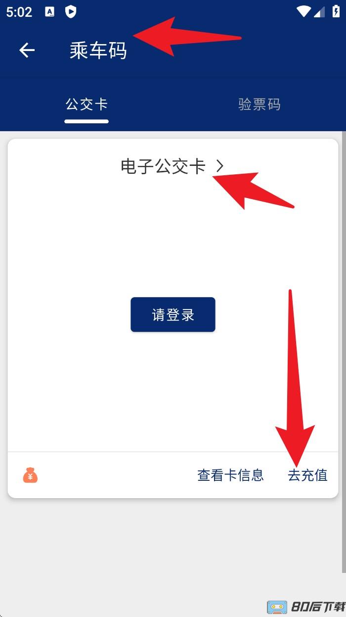 3. 点击底部乘车码入口,进入电子公交卡界面,可查看卡信息或进行充值操作。