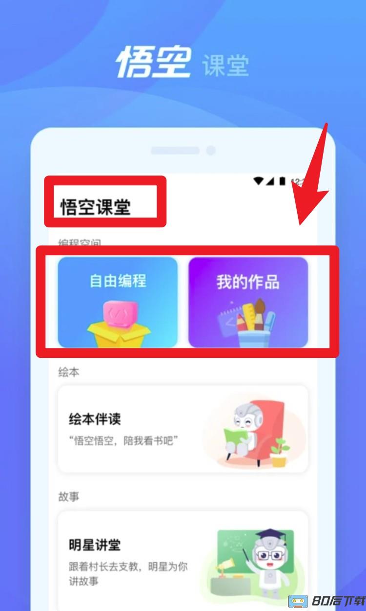 2. 在「悟空课堂」中点选「自由编程」或「我的作品」,孩子可进行简单逻辑搭建,也能上传自己的语音或图片进行创意展示。